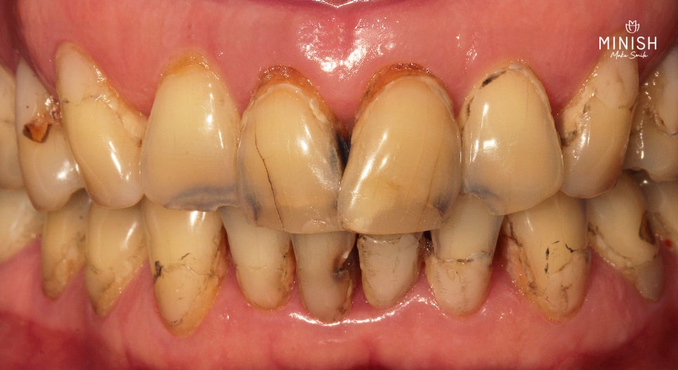 Because the patient had widespread cavities along with wear, erosion, cracks, and staining, treatment was performed using the Dual MINISH method, which covers both the front and back surfaces of the teeth. This can be considered in cases where broad damage exists and the patient wishes to restore function and aesthetics while aiming to minimize additional tooth reduction.