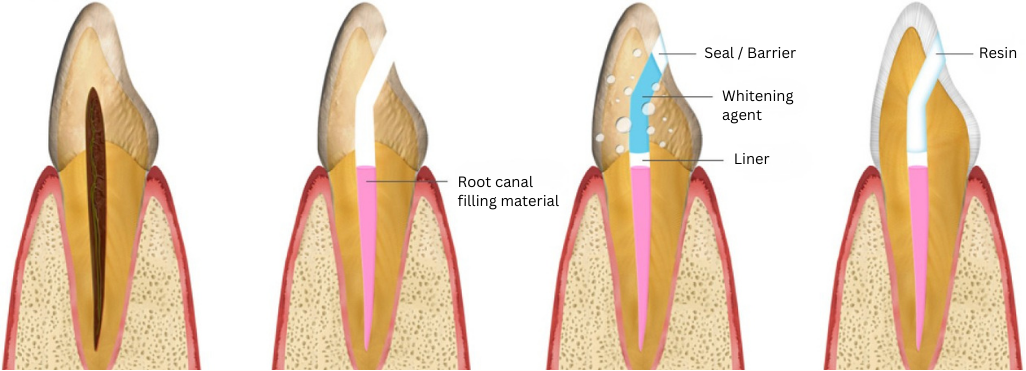 The tooth is filled with a whitening agent that is temporarily sealed and left for days or weeks to bleach the inside of the tooth. This may be repeated to achieve the desired result.